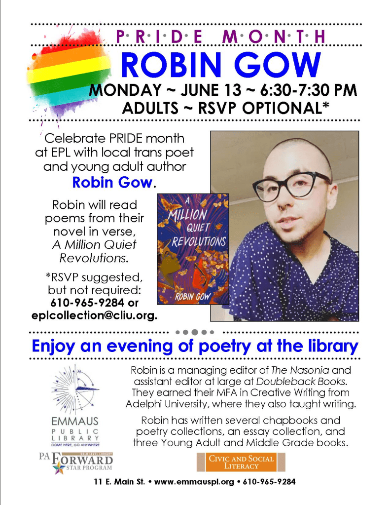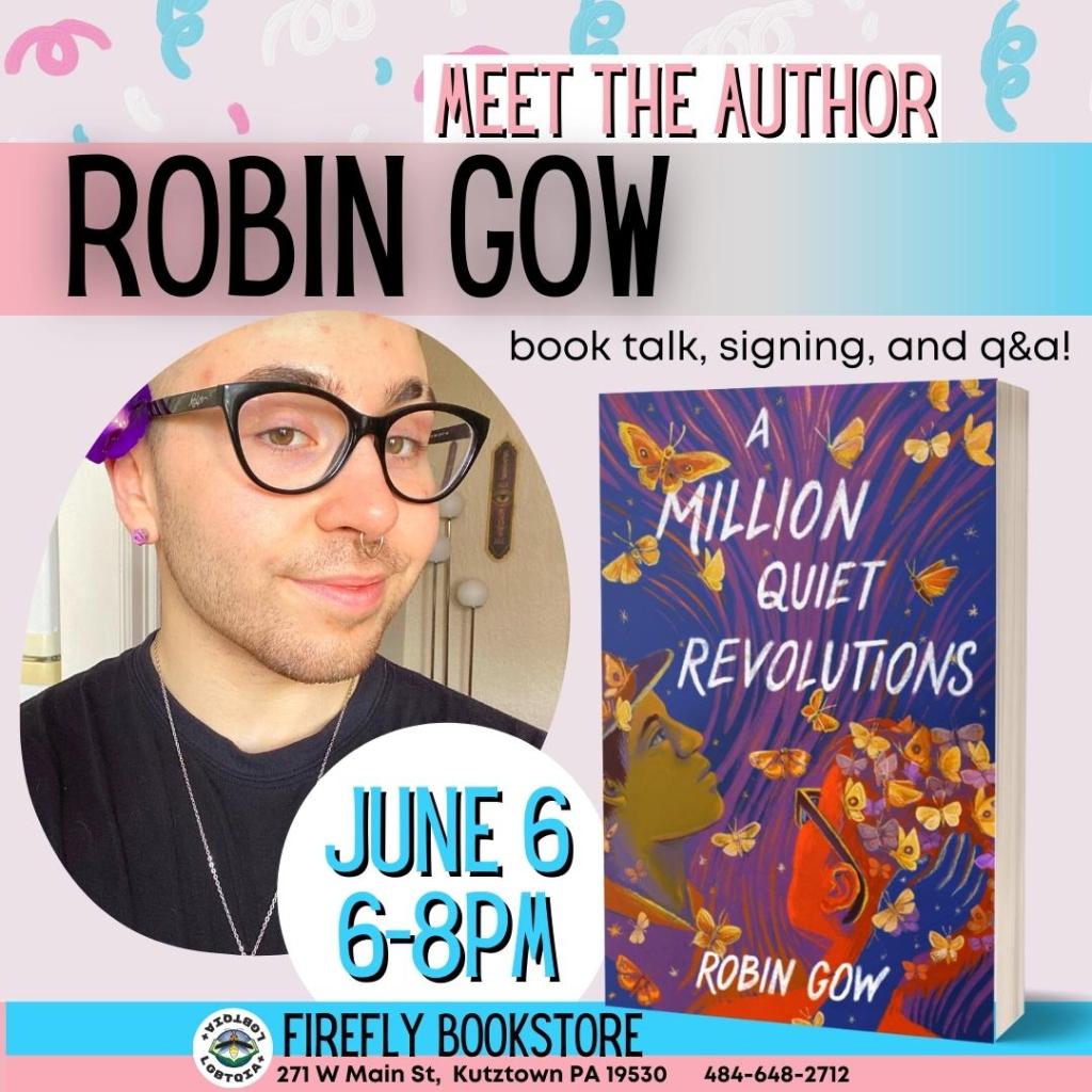 Join us in welcoming Robin Gow as they discuss and sign copies of A Million Quiet Revolutions, a modern love story, told in verse, about two teenaged trans boys who name themselves after two Revolutionary War soldiers, Saturday, November 5th at 2:00 PM. This is an in-person event.