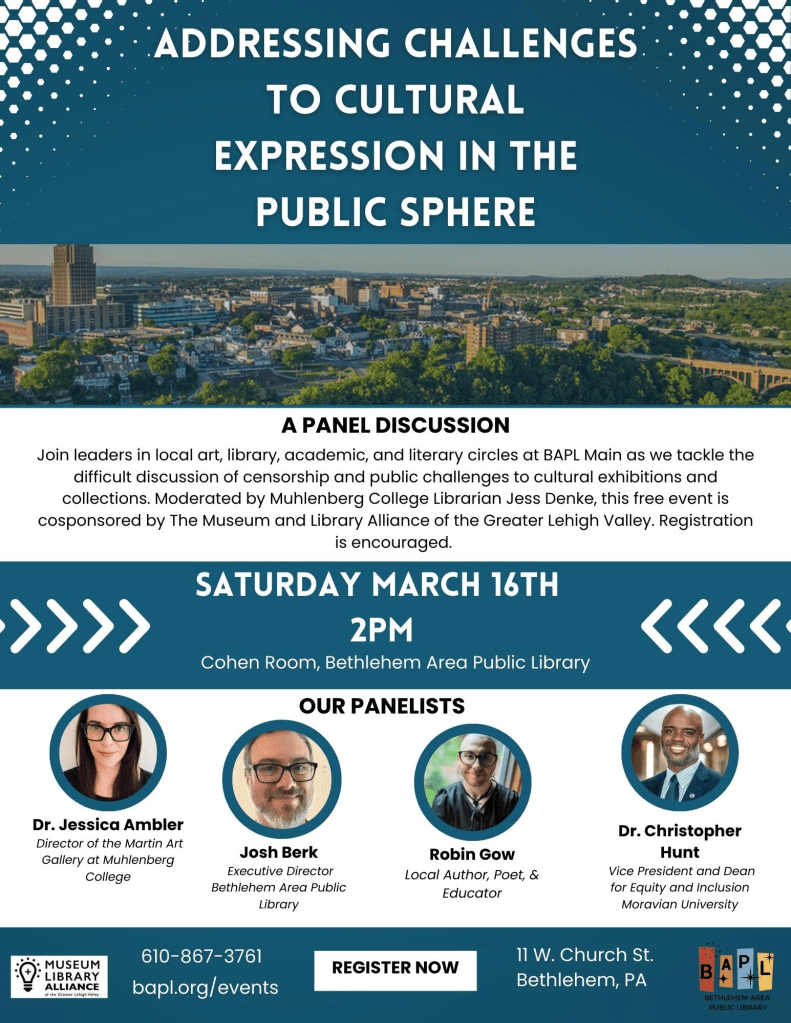 3/16 Panel Appearance “Addressing Challenges to Cultural Expression in the Public Sphere” 2pm Bethlehem Public Library