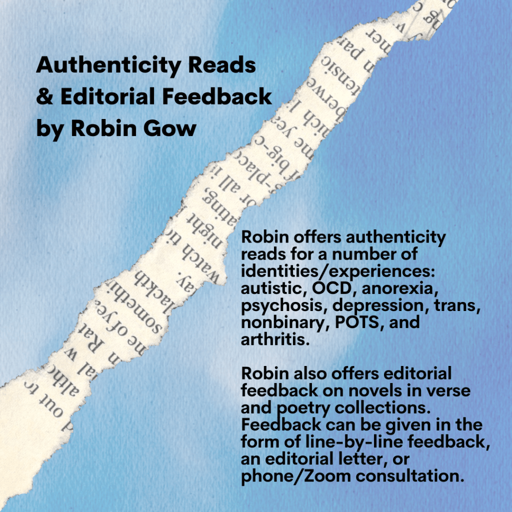 Robin also offers authenticity reads for a number of identities they hold: autistic, OCD, eating disorders, psychosis, depression, trans, nonbinary, EDS, POTS, and arthritis.